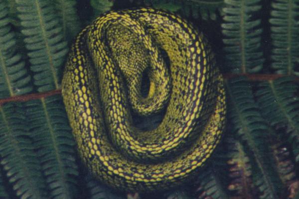 Bothriechis nigroviridis, die kleine, scheue Verwandte der gefährlichen Giftschlangen Bothrops asper und Bothrops schlegelii ist eine typische Baumschlange. Vorzüglich getarnt, lauert sie von Zweigspitzen aus auf Beute - vorzugsweise große Insekten, so weit wir beobachteten. Dieses Exemplar hat gerade einen kleinen Frosch gefressen und hält nun einen mehrtägigen Verdauungsschlaf.
