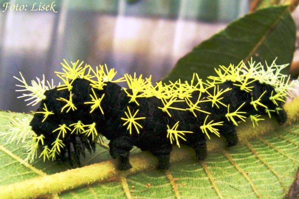 Es ist uns noch nicht gelungen herauszufinden, zu welchem Falter diese schöne, ca. 5cm große Raupe gehört. Vorsicht vor Berührung! Die gelben Borsten nesseln unangenehm.